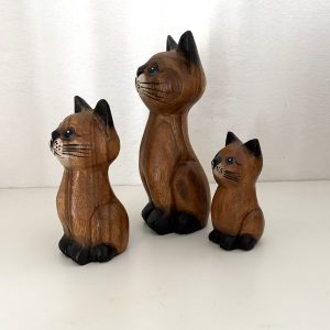 Set of three wooden cats,, hand carved in Thailand in Monkey pod wood.